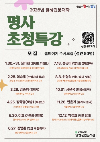 [뉴스다컴] 대구 달성군립도서관은 2026년 한 해 동안 지역 주민들을 위한 ‘명사초청특강’을 진행한다고 8일 밝혔다.