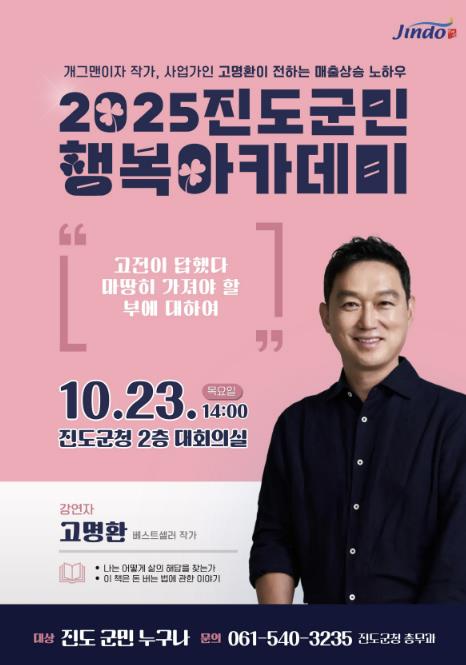 [뉴스다컴] 진도군은 오는 10월 23일 오후 2시, 진도군청 대회의실에서 개그맨 출신의 고명환 작가를 초청해 ‘진도 군민행복 아카데미’ 강연을 개최한다고 밝혔다.