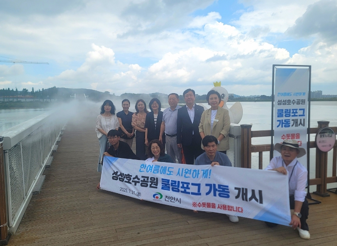 [뉴스다컴] 천안시는 도심 속 생태 휴식 공간인 성성호수공원에 물안개를 분사해 주변 온도를 낮추는 ‘쿨링포그’를 설치하고 가동에 돌입했다고 21일 밝혔다.