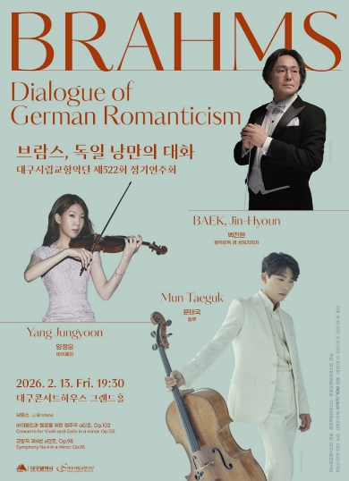 [뉴스다컴] 두 악기가 주고받는 정교한 선율에서 오케스트라가 만드는 밀도 높은 호흡까지, 대구시립교향악단은 오는 2월 13일 오후 7시 30분, 대구콘서트하우스 그랜드홀에서 '제522회 정기연주회 : 브람스, 독일 낭만의 대화'를 선보인다.