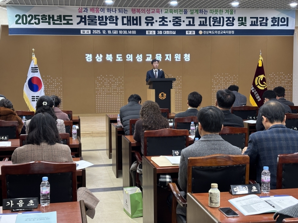 [뉴스다컴] 경상북도의성교육지원청은 12월 19일 의성교육지원청 3층 대회의실에서 '2025학년도 겨울방학 대비 유·초·중·고 교(원)장 및 교감 회의'를 개최하여 겨울방학 중 학생 안전을 확보하고 교육과정 마무리 및 새 학년도 준비 방향을 함께 모색하는 시간을 가졌다. 이번 회의는 ‘삶과 배움이 하나 되는 의성교육! 교육비전을 설계하는 따뜻한 겨울!’이라는 슬로건 아래, 학교 현장의 요구를 반영한 실질적인 협의에 중점을 두고 운영됐다.