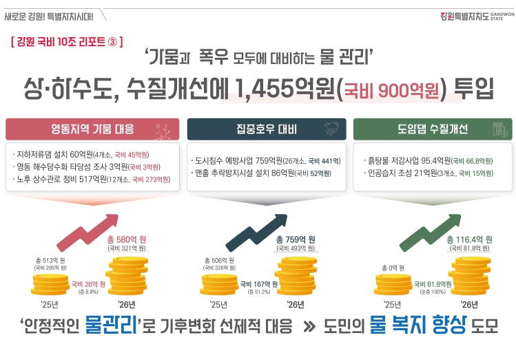 [뉴스다컴] 강원특별자치도는 내년도에 1,455억 원을 투입하여 가뭄 및 집중호우 등 물로 인한 기후변화와 자연재해로부터 안전한 강원자치도를 만들어 나갈 계획을 밝혔다.