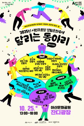 [뉴스다컴] (재)아산문화재단은 오는 10월 25일 13시부터 18시까지 아산문화공원 잔디광장에서 시민이 주체가 되어 즐기는 ‘2025년 시민주도형 생활문화 축제 '달리는 동아리'’를 개최한다.