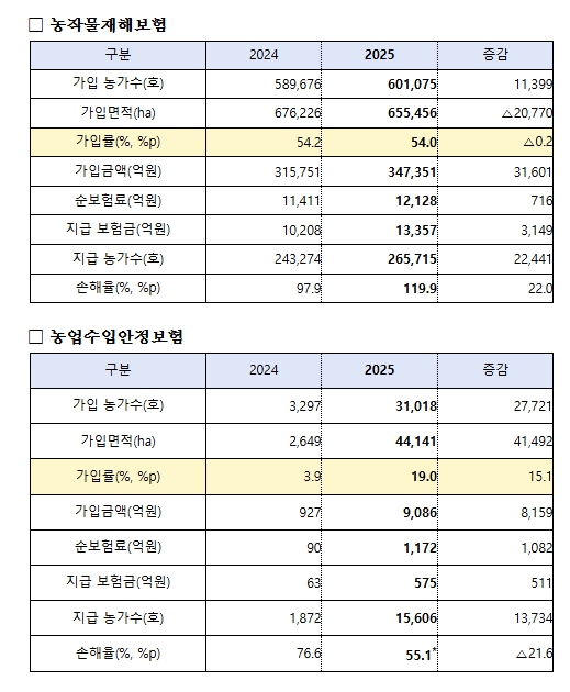 2025년에는 가입과 보상 모두 역대 최고 실적을 기록했다. 총 76개 품목 700천ha에 대해 632천명이 농작물보험에 가입했으며, 가입률은 전년 대비 3.3%P 증가한 57.7%, 순보험료 총액은 1조 3,300억원이었다. 가입률이 높은 품목은 사과 105.8%, 월동무 94.0%, 배 86.9%, 가을무 71.4%, 콩 67.8%, 벼 65.1% 등이었다.