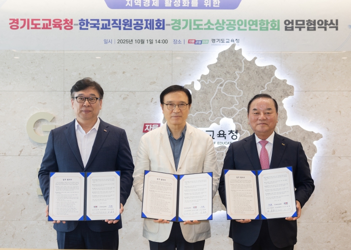 [뉴스다컴] 경기도교육청이 1일 남부청사에서 경기도소상공인연합회, 한국교직원공제회와 ‘지역경제 활성화를 위한 상생 업무협약’을 체결했다.