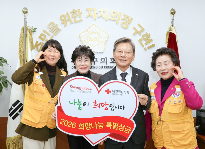 [뉴스다컴] 대구 수성구의회는 13일 대한적십자사 대구지사에 ‘2026 희망나눔 특별성금’ 100만원을 전달했다.