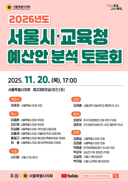 [뉴스다컴] 서울특별시의회는 2025년 11월 20일 오후 5시, 서울특별시의회 제2대회의실에서 '2026년도 서울시·교육청 예산안 분석 토론회'를 개최한다.