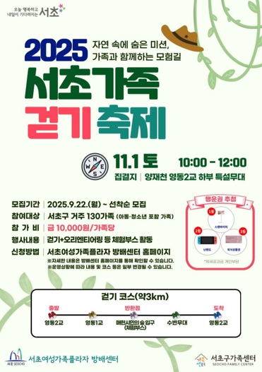 [뉴스다컴] 서울 서초구는 서초여성가족플라자 방배센터, 서초구 가족센터와 함께 11월 1일 서울의 대표적인 생태하천인 양재천에서 ‘2025 서초가족 걷기 축제’를 개최한다고 밝혔다.