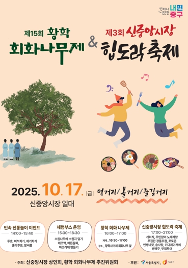 [뉴스다컴] 서울 중구 황학동의 오랜 전통을 품은‘황학회화나무제’와 젊은 감각이 살아 있는‘신중앙시장 힙도락(HIP:道樂) 축제’가 오는 17일 오후 2시에 함께 열린다. 두 축제는 2023년부터 연계 개최해, 황학동의 가을을 더욱 풍성히 채우고 있다.