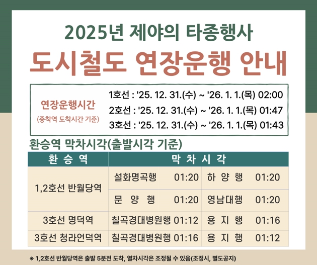 한편, 행사 당일 밤 10시 30분부터 다음날 01시 30까지 동인네거리~삼덕네거리, 공평네거리~동신교 서편 구간이 전면 통제된다. 행사장 인근을 통과하는 시내버스 18개 노선*은 밤 10시 30분 이후 행사장을 우회 운행하고, 직행 1개 노선과 급행 4개 노선**은 새벽 1시경 시내를 통과한다. 도시철도는 반월당역과 명덕역을 다음날 01시 10분경 통과하도록 연장 운행해 시민들의 안전한 귀가를 도울 계획이다.