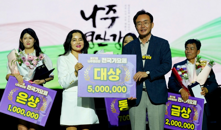 ▲ 윤병태 시장(오른쪽)이 ‘제17회 나주 영산강 전국 가요제’에서 대상을 수상한 장성희 씨에게 상금 500만 원을 전달하고 기념사진을 찍고 있다.