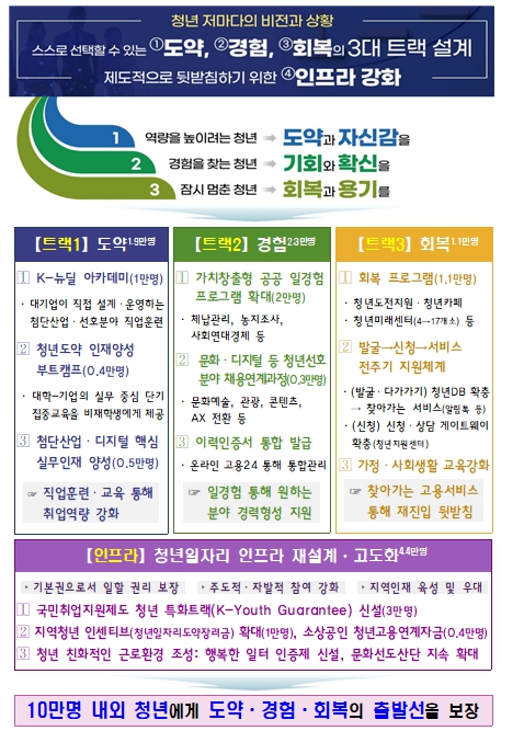 정부는 이러한 문제 인식 하에 2030 청년들의 현장 목소리를 바탕으로 새로운 출발선을 제공하기 위해 이번 「청년뉴딜 추진방안」을 마련했다. 청년들이 자신의 비전과 상황을 고려하여 적합한 프로그램을 선택할 수 있도록 ➊도약, ➋경험, ➌회복이라는 세 가지 트랙을 제시하고, 원활한 구직활동과 채용을 뒷받침하기 위해 ➍정책 인프라도 고도화했다.