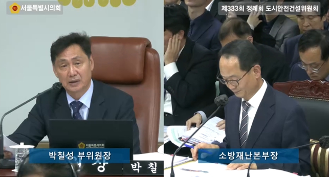 [뉴스다컴] 서울특별시의회 도시안전건설위원회에서 부위원장으로 의정활동 하고 있는 박칠성 시의원(더불어민주당, 구로4)은 지난 5일 열린 서울특별시의회 제333회 정례회 도시안전건설위원회 소관 소방재난본부 행정사무감사에서 화재안전 사각지대의 문제점을 지적하고 실효성 있는 대책 마련을 촉구했다.