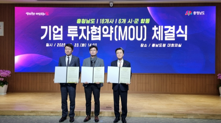 | ▲ 23일 충남도청 대회의실에서 열린 서산시·동해금속㈜ 자동차 부품 공장 증설 투자협약(왼쪽부터 홍순광 서산시 부시장, 장혁재 동해금속㈜ 부사장, 김태흠 충남도지사) |