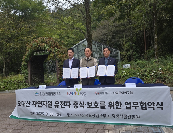 [뉴스다컴] 강원특별자치도 산림과학연구원은 9월 30일 국립공원공단 오대산국립공원사무소, 평창군과 우수 산림 유전자원 보존을 위한 업무협약을 체결하고, 오대산국립공원 내 보호수로 지정된 잎갈나무의 후계목을 육성하고 있다고 밝혔다.