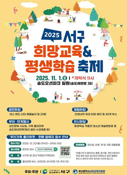 [뉴스다컴] 부산 서구는 오는 11월 1일 송도오션파크에서 서부교육지원청과 공동으로 '2025년 서구 희망교육 & 평생학습 축제'를 개최한다.