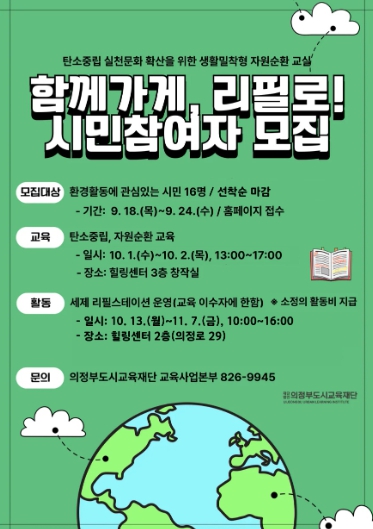 [뉴스다컴] (재)의정부도시교육재단은 9월 18일부터 시민 아이디어를 실제 사업으로 구현한 생활밀착형 자원순환 교실 ‘함께가게, 리필로!’의 시민 참여자를 모집한다.