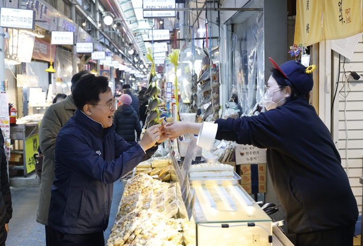 시장 곳곳의 점포를 방문해 한과, 딸기, 떡 등을 온누리상품권으로 구매하며 장바구니 체감 물가도 살폈다.