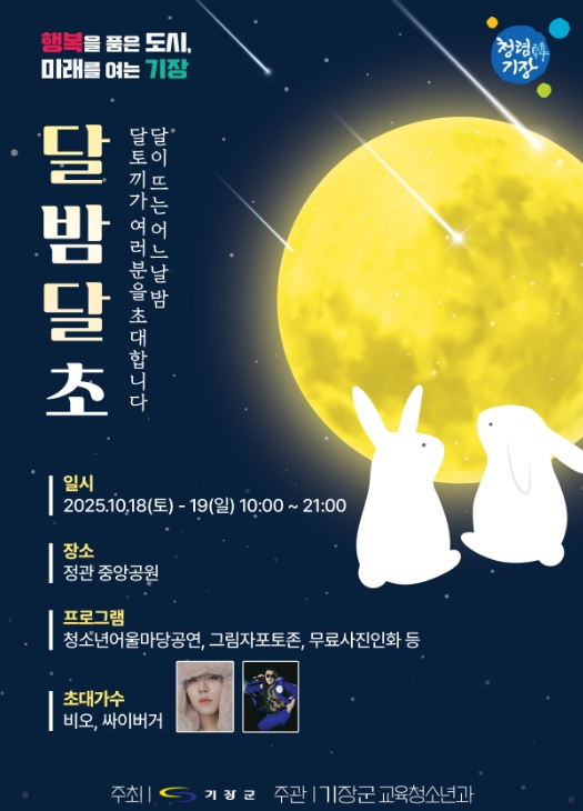 [뉴스다컴] 기장군은 오는 18일부터 19일까지 정관읍 중앙공원 일원에서 2025 기장군청소년어울마당 ‘달밤달초’를 개최한다고 15일 밝혔다.