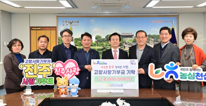 [뉴스다컴] 진주시는 3일 시청 기업인의 방에서 산청군농협 임직원 80여 명이 동참한 고향사랑기부금 800만 원을 기탁받았다고 전했다.