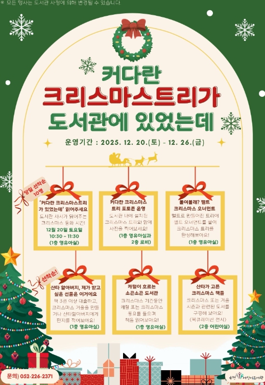 도서관 관계자는 “도서관이 단순히 책을 읽는 공간을 넘어, 계절과 이야기를 함께 경험하는 문화공간이 되기를 바란다”며 “이번 크리스마스 행사를 통해 아이들이 책과 더욱 가까워지고, 가족이 함께 따뜻한 시간을 보내길 기대한다”고 전했다.
