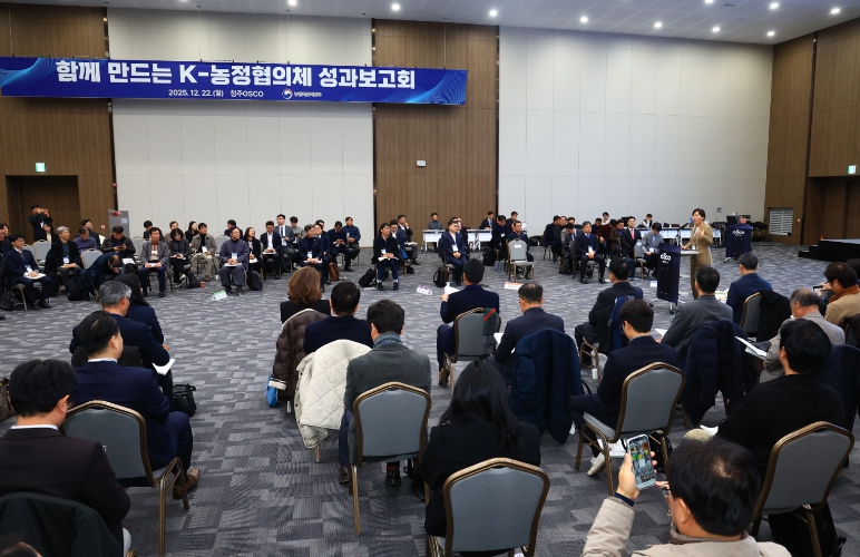 [뉴스다컴] 농림축산식품부는 12월 22일 오후 청주오스코(OSCO)에서 '함께 만드는 K-농정협의체' 성과보고회를 개최했다. 이번 행사에는 K-농정협의체 공동대표인 송미령 농식품부 장관과 류진호 한국4-H청년농업인연합회 회장을 비롯한 협의체 위원 120여 명과 농어업농어촌특별위원회 김호 위원장을 포함한 관계자 30여 명 등 총 150여 명이 참석했다.