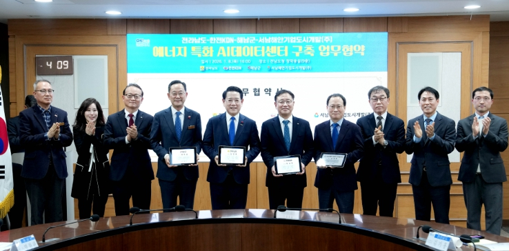 [뉴스다컴] 전라남도는 8일 한전KDN, 해남군, 서남해안기업도시개발㈜와 에너지 특화 AI 데이터센터 구축 및 AI·에너지 신산업 육성을 위한 업무협약을 했다.