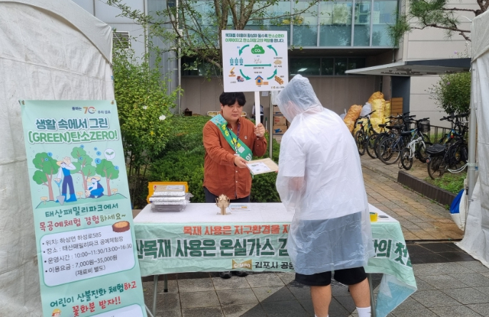 [뉴스다컴] 김포시는 지난 19일 장기동 한강중앙공원에서 국산 목재 이용, 탄소중립 실현, 목재 이용 문화 정착을 촉진하기 위하여 목재이용 권장 캠페인을 개최했다.