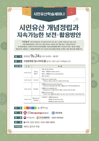 [뉴스다컴] 경기문화재단은 오는 10월 24일 오후 2시, 수원문화원 빛누리아트홀에서 ‘시민유산 개념정립과 지속가능한 보전·활용방안’ 학술 세미나를 개최한다고 밝혔다. 세미나는 문화유산을 소수 전문가의 영역에서 시민 모두의 유산으로 확장하고, 그 가치를 지속가능하게 보전, 활용하는 방안을 모색하기 위해 기획됐다.