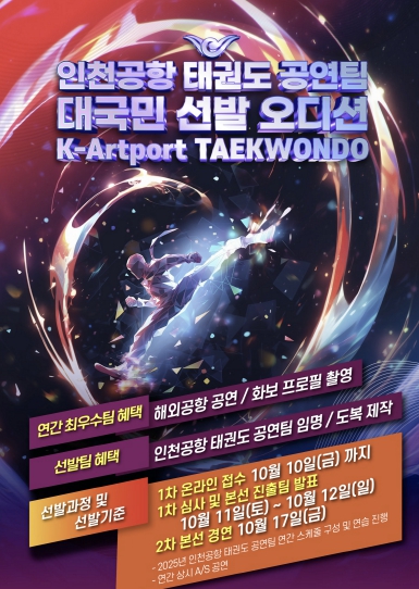 [뉴스다컴] 인천국제공항공사는 인천공항에서 진행되는 태권도 상설공연인 ‘2025-2026 인천공항 태권도 상설공연’에 참여할 태권도 전문 공연팀을 공개 모집한다고 28일 밝혔다.