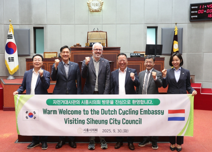 [뉴스다컴] 시흥시의회 도시환경위원회가 9월 30일 의회청사 소담뜰에서 네덜란드 자전거대사관(Dutch Cycling Embassy, DCE)을 초청해 간담회를 열고, 시흥시 자전거 정책 발전 방향과 친환경 교통 시스템 구축 방안에 대해 논의했다.