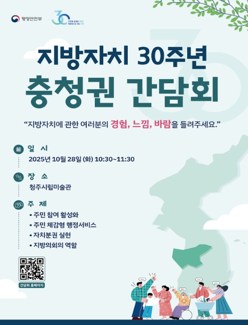 [뉴스다컴] 행정안전부는 10월 28일 충청북도 청주시립미술관에서 민선 지방자치 30주년 충청권 간담회를 개최한다고 밝혔다.