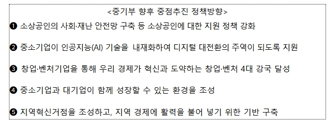 한성숙 장관은 간담회 모두 발언을 통해 ▲소비·투자 심리 위축으로 인한 민생경제의 어려움, ▲보호무역 주의 확산 등 세계(글로벌) 경제 불확실성, ▲인공지능 확산 등 디지털 전환 가속화, ▲지역 공동화 및 격차 심화 등 우리 경제가 직면한 주요 문제를 조목조목 짚으며, 지금 우리가 어떻게 대응하느냐에 따라 이러한 문제들이 위기로 심화 될 수도, 기회의 발판이 될 수도 있는 중대한 전환점이라고 진단했다. 이와 함께 중기부가 향후 중점 추진해야 할 5가지 정책방향을 제시했다.