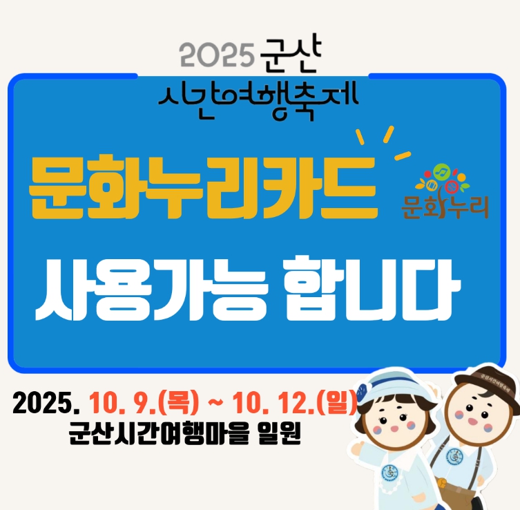 [뉴스다컴] 군산시가 12일까지 열리는 '2025 군산시간여행축제' 기간 동안 통합문화이용권(문화누리카드) 임시 가맹점을 운영해 시민들이 축제 현장에서 더욱 쉽고 편리하게 통합문화이용권(문화누리카드)를 사용할 수 있도록 지원했다.