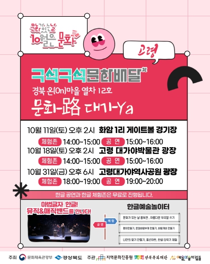 [뉴스다컴] 2025 문화가 있는 날 '구석구석 문화배달' 경북 온(On)마을 열차 12호 고령군 ‘문화路 대가ya’가 10월 문화의 달을 맞아 총 3회의 공연을 선보인다. 이번 행사는 문화체육관광부와 경상북도가 주최하고, 지역문화진흥원·경북문화재단·예술마을사람들이 주관하며, 고령군과 협력해 진행된다.