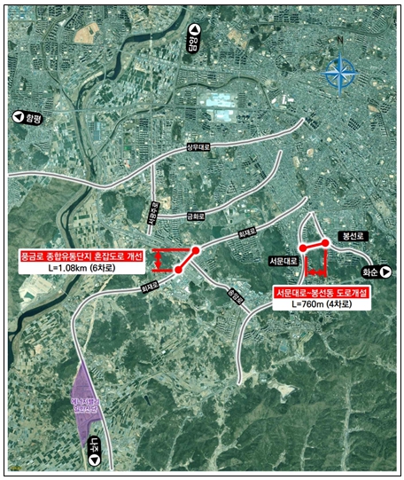 ◇‘서문대로~봉선동’ 4차로 도로개설 사업은 봉선‧진월지구를 연결하기 위해서는 현재 백운광장을 우회해야해 서문대로 및 봉선로에 차량이 집중되어 발생되는 극심한 혼잡을 해소하기 위해 추진하는 사업으로 터널이 개설되면 봉선지구와 진월지구가 직접 연결되어 교통효율이 대폭 개선될 것으로 기대된다.