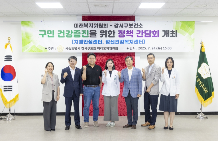 [뉴스다컴] 강서구의회 미래복지위원회가 지난 7월 24일 강서구의회 다목적실에서 열린 ‘구민 건강 증진을 위한 정책간담회’에서 강서구치매안심센터와 강서구정신건강복지센터의 운영 현황을 점검하고, 현장 실무자들의 애로사항을 청취하며 관련 사업의 활성화를 위한 구체적 방안을 논의했다.