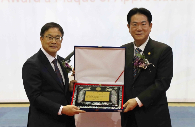 | ▲ 윤웅석 국기원장이 이동섭 전 국기원장에게 감사패를 전달하고 기념촬영을 하고 있다. |
