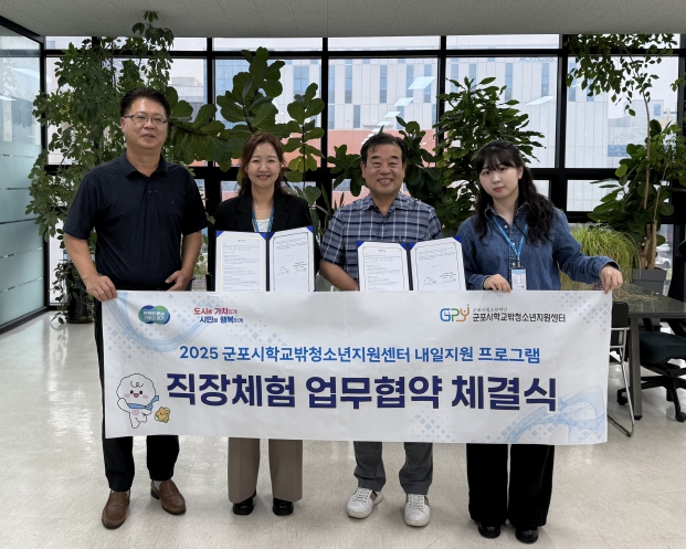 [뉴스다컴] 군포시청소년재단(대표이사 김덕희), 군포시학교밖청소년지원센터(센터장 강연미)는 시각디자인 분야로의 진학과 진로를 희망하는 학교 밖 청소년을 지원하기 위해 관내 디자인 전문업체인 ㈜은진과 직장체험 업무협약을 체결했다고 밝혔다.