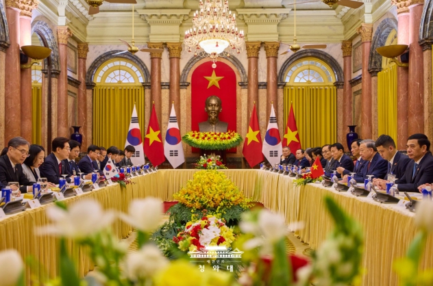 [뉴스다컴] 베트남을 국빈 방문 중인 이재명 대통령은 22일(현지시간) 오후 베트남 국가주석궁에서 또 럼 당서기장 겸 국가주석과 정상회담을 갖고, 양국 간 포괄적 전략 동반자 관계 발전 방안과 지역·국제 정세 등에 대해 심도 있게 논의했다고 이규연 청와대 홍보소통수석이 서면 브리핑했다.