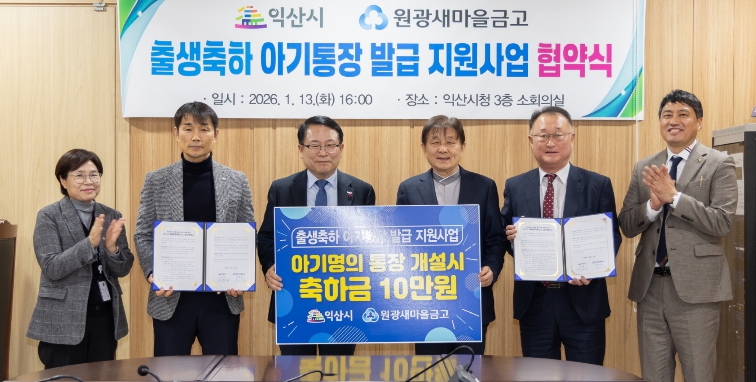 익산시는 13일 시청 소회의실에서 원광새마을금고와 '출생축하 아기통장 발급 지원사업'을 위한 업무협약을 체결했다.