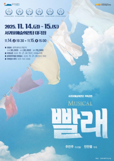 서귀포예술의전당 관계자는 “뮤지컬 ‘빨래’는 힘겨운 현실 속에서도 서로에게 위로가 되어주는 사람들의 이야기를 통해 관객들에게 공감과 감동을 선사하는 작품”이라며, “이번 공연이 도민들에게 따뜻한 휴식과 희망의 시간이 되길 바란다”라고 전했다.