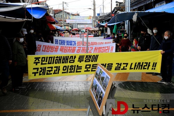 [뉴스다컴] 지난 8월 8일 집중호우와 섬진강댐 대량 방류로 섬진강 하류지역 등지에 사상 최악의 수해 참사를 겪은지 100일 맞아 지난달 18일 구례군 구례읍 5일 시장에서 소상공인과 주민들이 책임자 처벌과 배상 촉구 궐기대회를 열었다.
