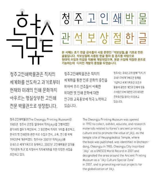 청주고인쇄박물관 관계자는 “이번에 개발한 청주 석보상절체는 시인성도 좋고 현대적 느낌의 디자인이어서, 팸플릿 등 홍보물을 비롯한 다양한 인쇄매체에 활용할 수 있다”면서 “고문서를 기반으로 개발된 청주 석보상절체가 널리 사용돼, 고인쇄에 대한 시민들의 관심도 높아지길 기대한다”고 밝혔다.
