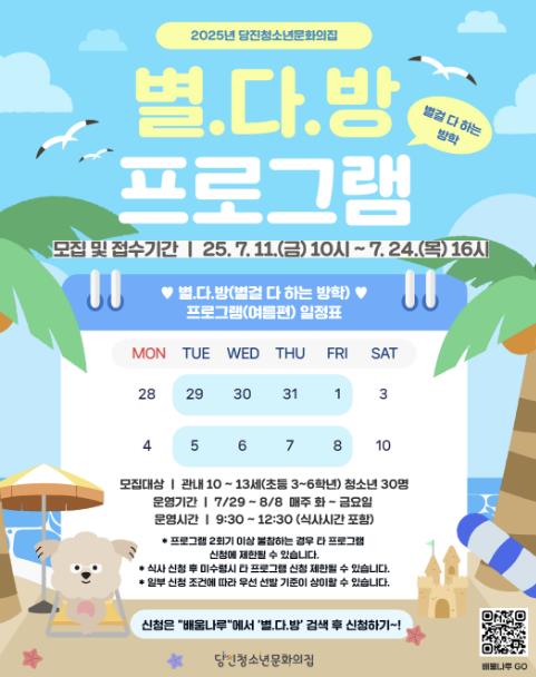 [뉴스다컴] (재)당진시청소년재단 당진청소년문화의집에서는 7월 29일부터 8월 8일까지 총 8회기에 걸쳐 관내 10 ~ 13세(초3~6학년) 청소년을 대상으로 별.다.방(별걸 다 하는 방학) 프로그램 [보드펜 창작연구소]를 운영할 예정이다.