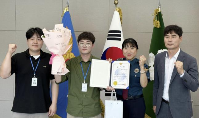 ▲ 11일 태안경찰서에서 진행된 감사장 수여식 모습(사진 왼쪽에서 두 번째 이진선 주무관, 세 번째 정혜심 태안경찰서장) |