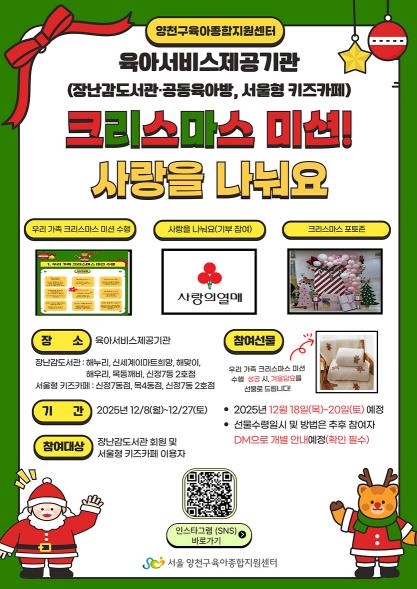 [뉴스다컴] 양천구는 크리스마스를 맞아 관내 장난감도서관 및 서울형 키즈카페 이용 가족을 대상으로 ‘2025 크리스마스 미션! 사랑을 나눠요’ 이벤트를 12월 8일부터 27일까지 운영한다고 밝혔다.
