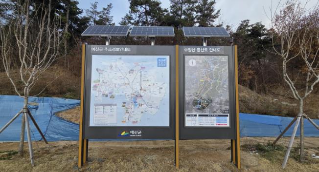 안내판에는 현재 위치를 확인할 수 있는 수암산 등산로 안내지도와 예산군 관광지 주소정보 안내도가 함께 구성돼 이용객에게 다양한 정보를 제공한다.