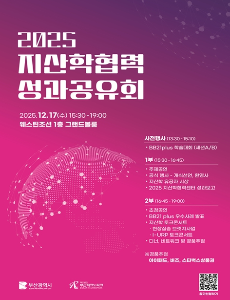 [뉴스다컴] 부산시는 오늘(17일) 오후 3시 30분 웨스틴조선호텔에서 '2025 지산학협력 성과공유회'를 개최한다고 밝혔다.