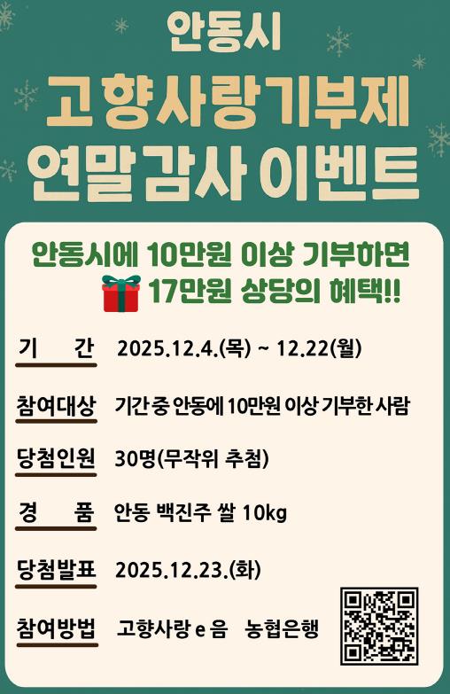 [뉴스다컴] 안동시는 연말정산 시즌을 맞아, 고향사랑기부제 참여자에게 감사의 뜻을 전하고 기부 문화를 확산하기 위해 12월 22일(월)까지 ‘안동시 고향사랑기부제 연말 감사 이벤트’를 진행한다고 밝혔다.